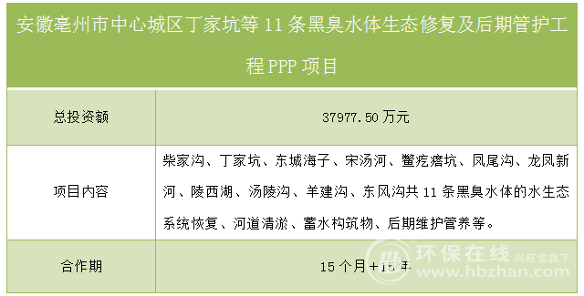 安徽亳州市中心城区丁家坑等11条黑臭水体生态修复及后期管护工程PPP项目